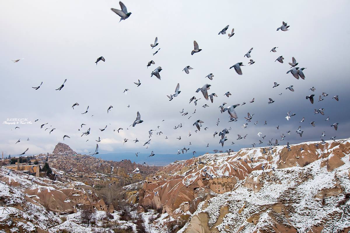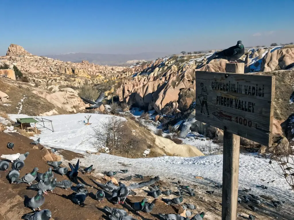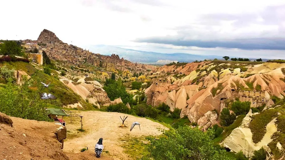 - Pigeon Valley – At Pigeon Valley, you stop at a panoramic viewpoint that looks over a long valley filled with small pigeon houses carved into the cliffs. In the past, locals used these pigeon houses for natural fertilizer in their fields and vineyards. Today, the valley offers some of the most classic Cappadocia views, with Uçhisar Castle in the distance and fairy chimneys all around.
