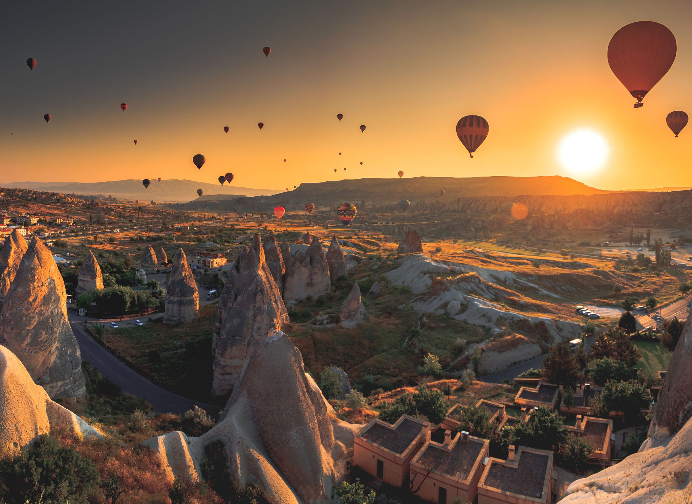 Take-off and climb into the sky – You step into the smaller deluxe basket, shared with up to 20 guests. As the burners warm the air, the balloon gently leaves the ground and rises above the valleys. Soon you are floating quietly in the air while the sun comes up over Cappadocia.